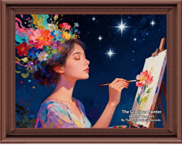 About : A beautiful women imagining while the flower that she painted comes out of the frame in abstract art style.