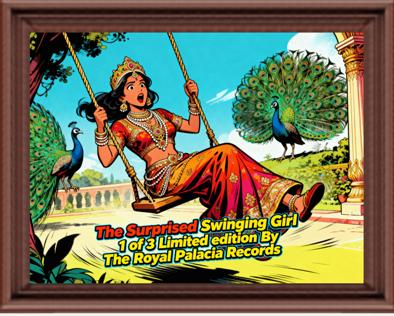 About : A girl Swinging surprised to see two peacocks looking at her all in pop art style.